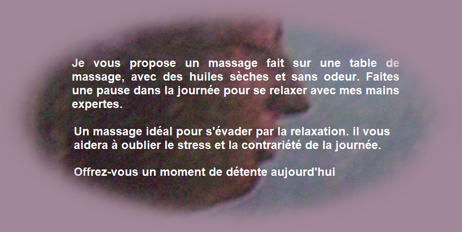 Je vous propose un massage fait sur une table de massage, avec des huiles sèches et sans odeur. Faites une pause dans la journée pour se relaxer avec mes mains expertes.