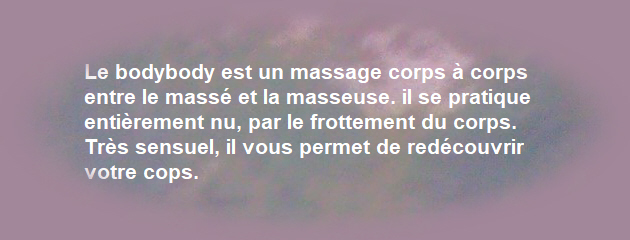 Le bodybody est un massage corps à corps entre le massé et la masseuse. il se pratique entièrement nu, par le frottement du corps. Très sensuel, il vous permet de redécouvrir votre cops.