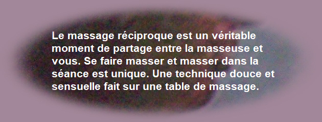 Le massage réciproque est un véritable moment de partage entre la masseuse et vous. Se faire masser et masser dans la séance est unique. Une technique douce et sensuelle fait sur une table de massage.
